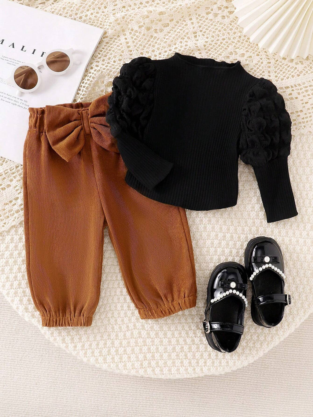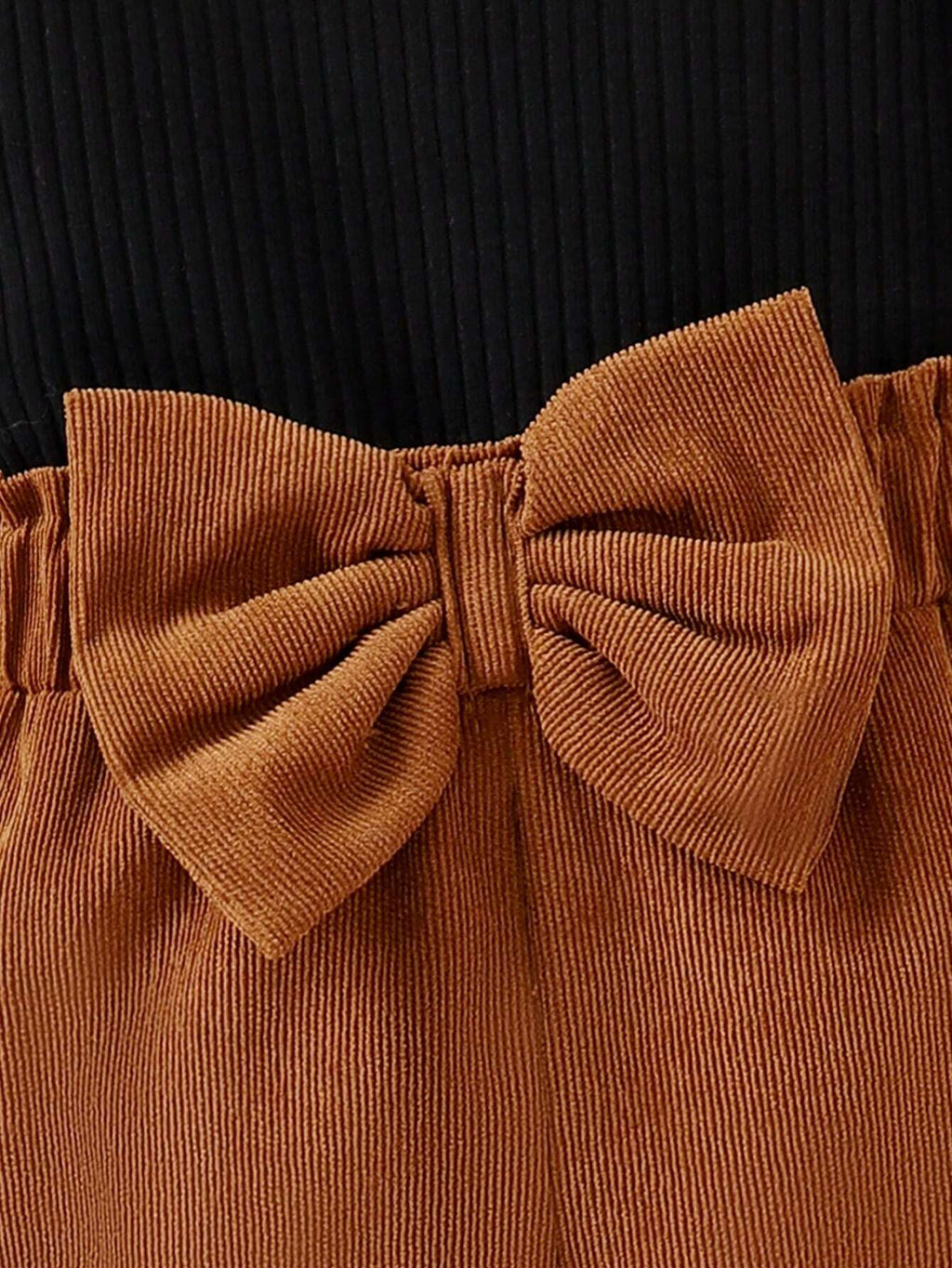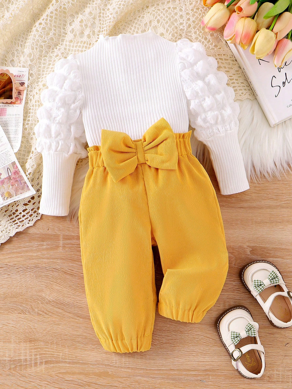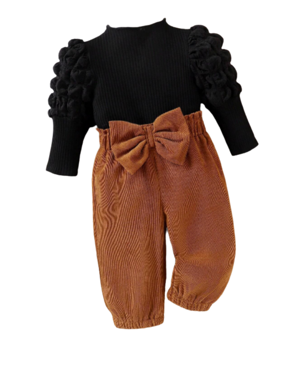 A blusa é feita em malha de algodão canelada, e a calça com lacinho são feitos em tecido macio, sedoso e leve.