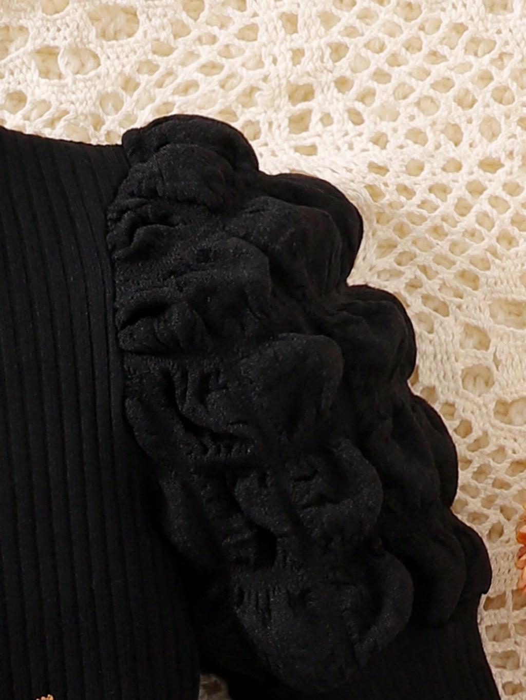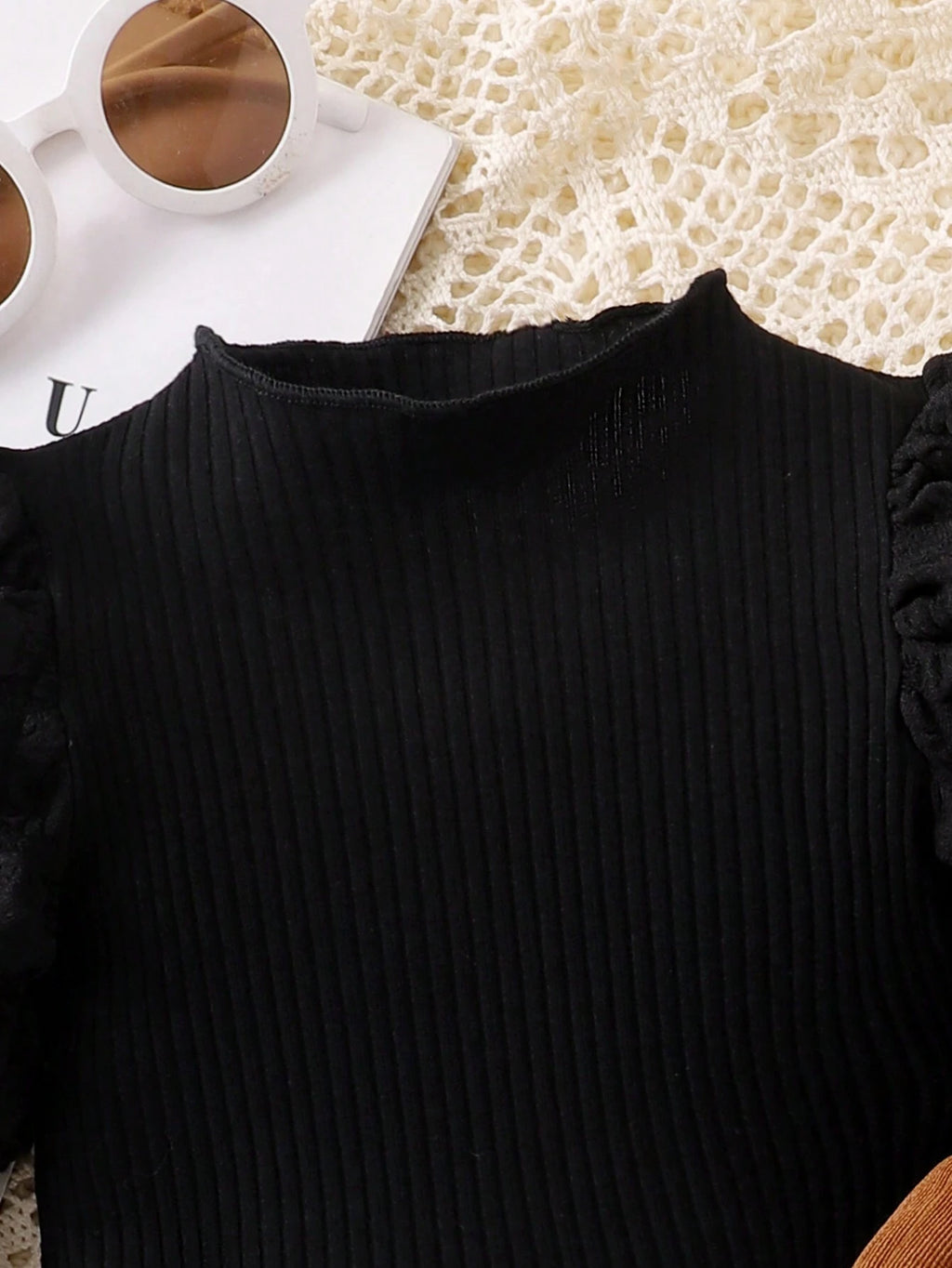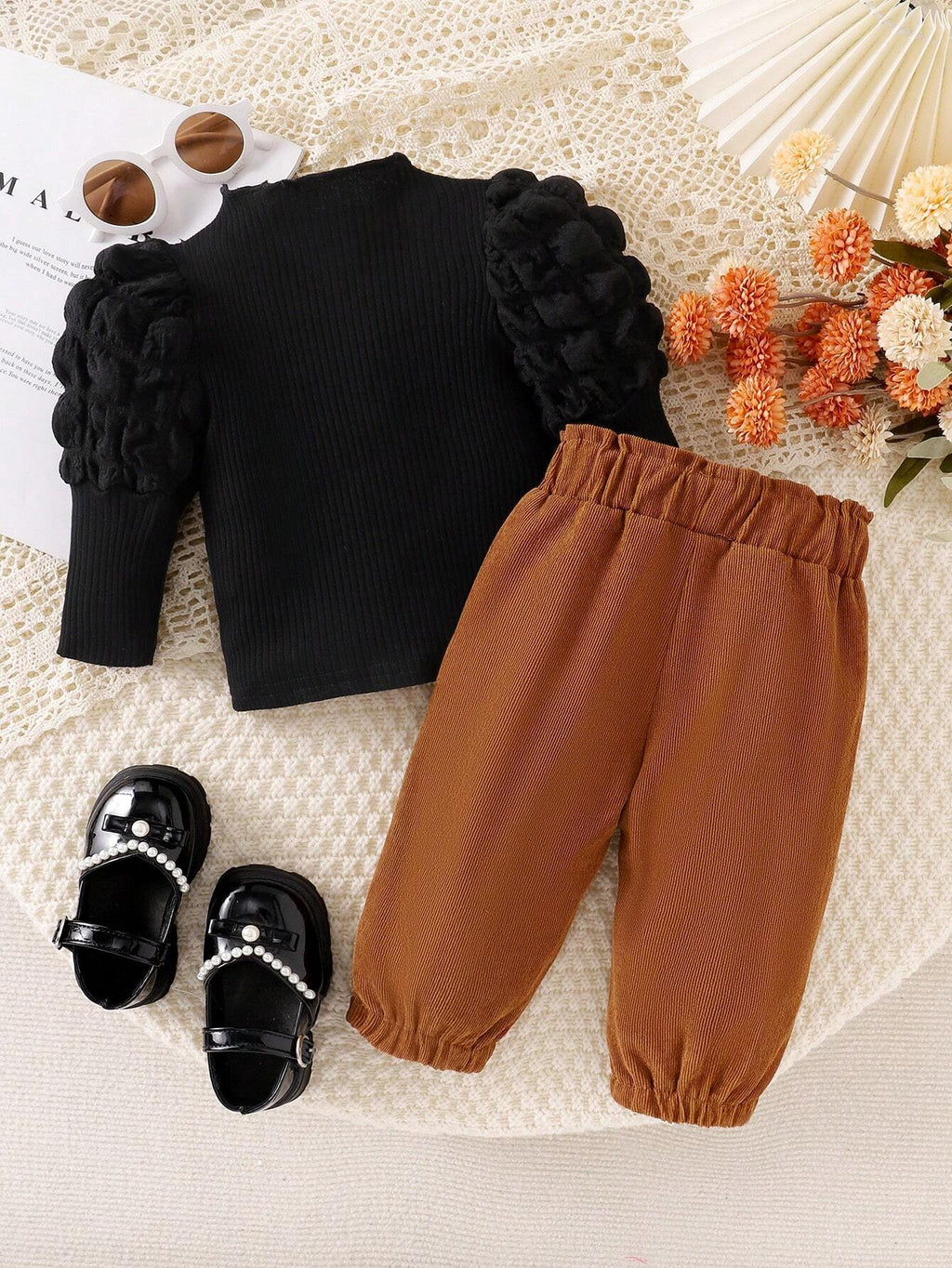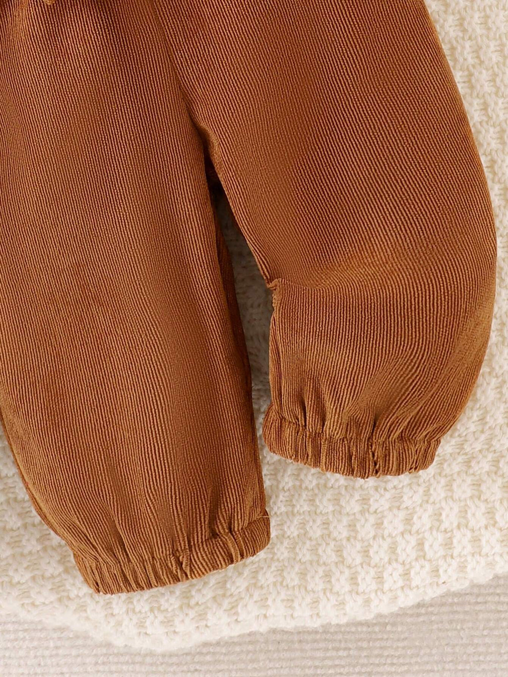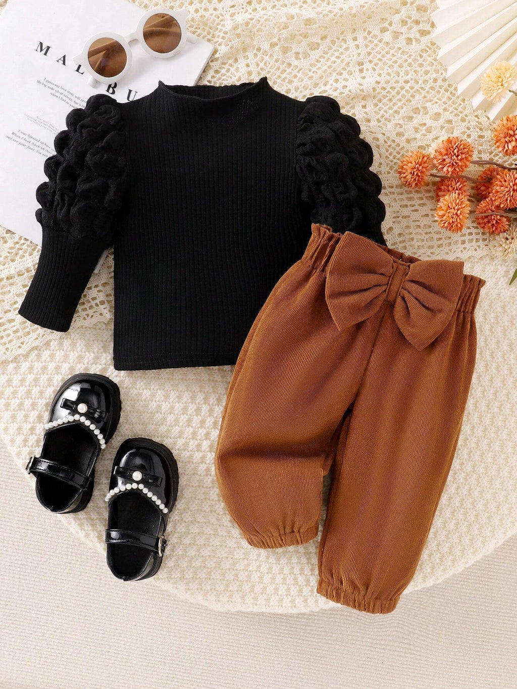 A blusa é feita em malha de algodão canelada, e a calça com lacinho são feitos em tecido macio, sedoso e leve.