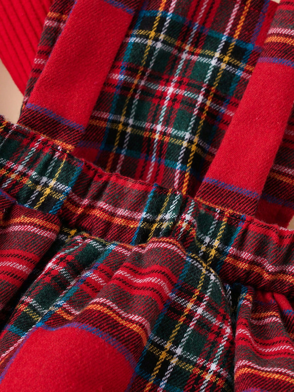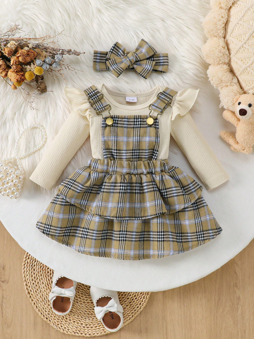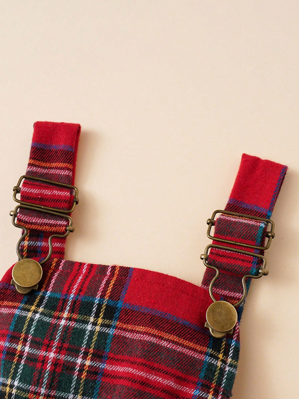 Body de Manga Curta Tricô + Vestido Jardineira com Estampa Xadrez Faixa de Cabeça: