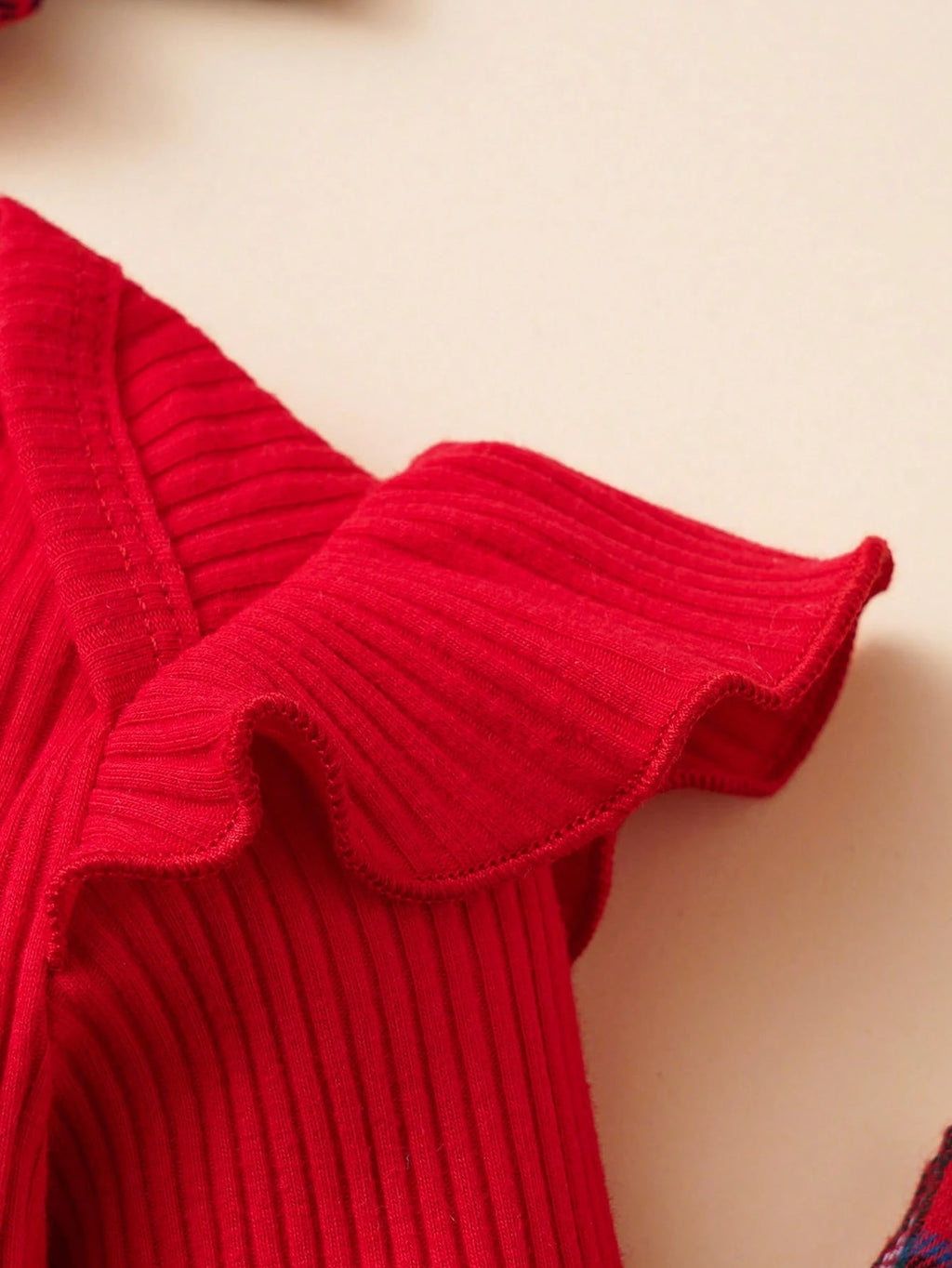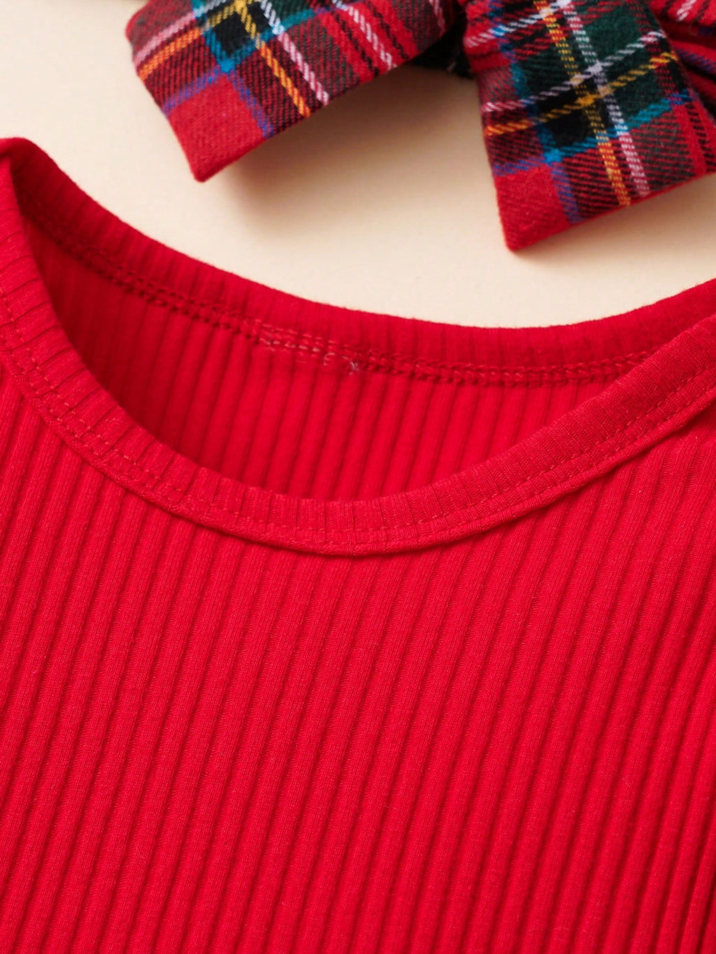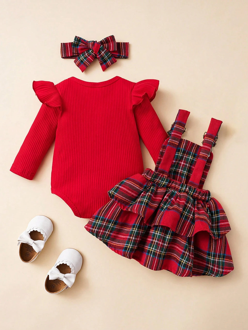 Body de Manga Curta Tricô + Vestido Jardineira com Estampa Xadrez Faixa de Cabeça: