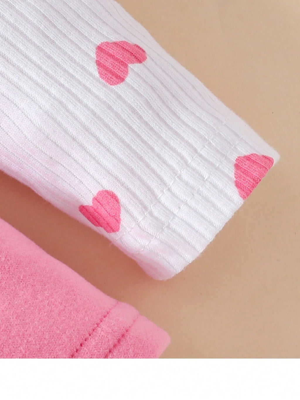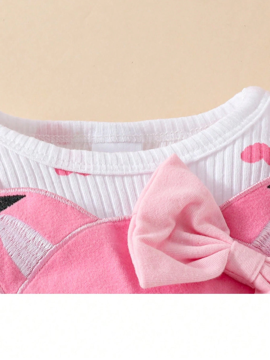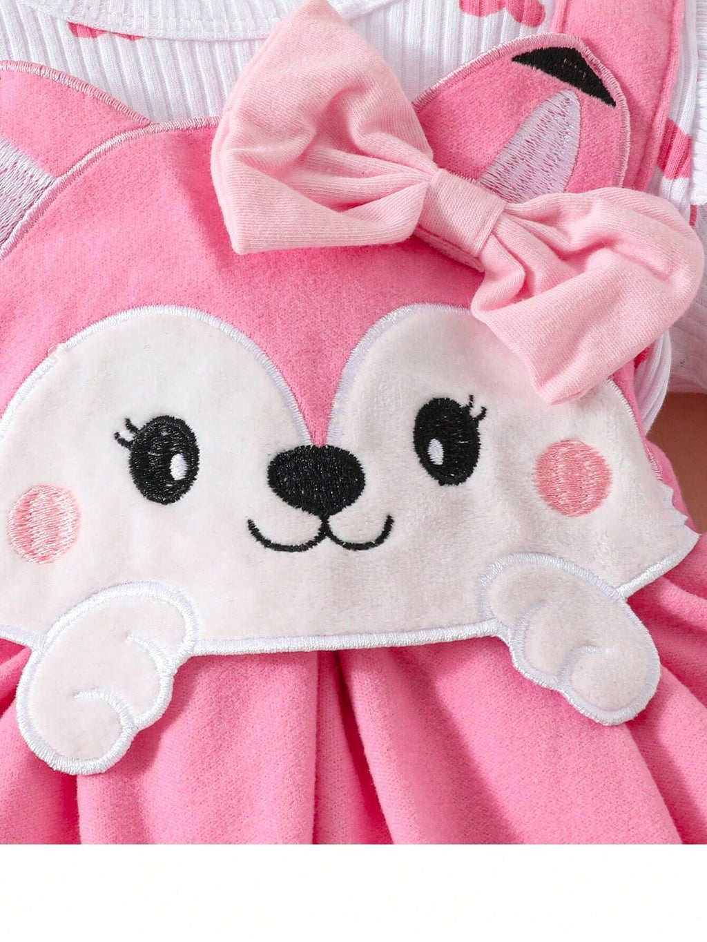 Body com estampa de coração, vestido com bordado de raposinha e tiara cor de rosa: