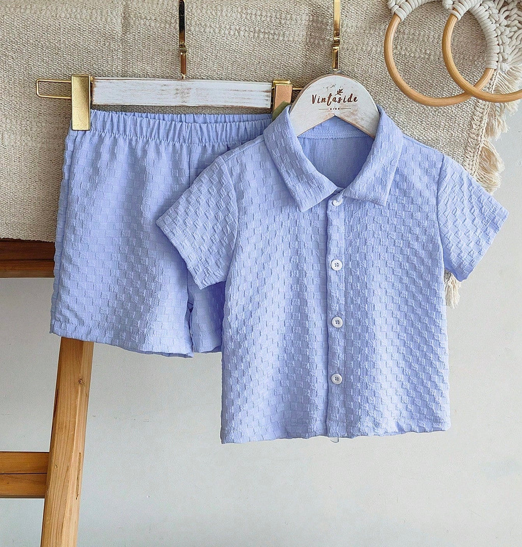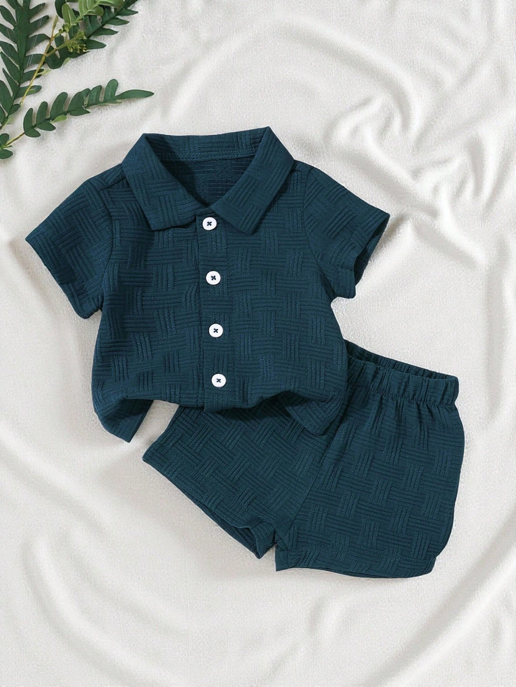 Conjunto de Camiseta e Shorts Malha Texturizada 2 Peças 100% algodão, com gola, abertura frontal feita por botões de casinha, e por botões de pressão nas pernas. Já o com botões de casinha no cós para abrir, e elástico na cintura para melhor ajuste, em Oxford, confeccionado 98% algodão e 2% elastano.